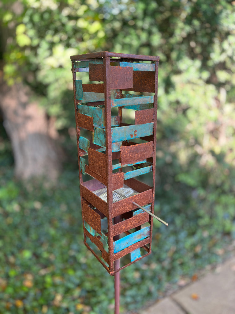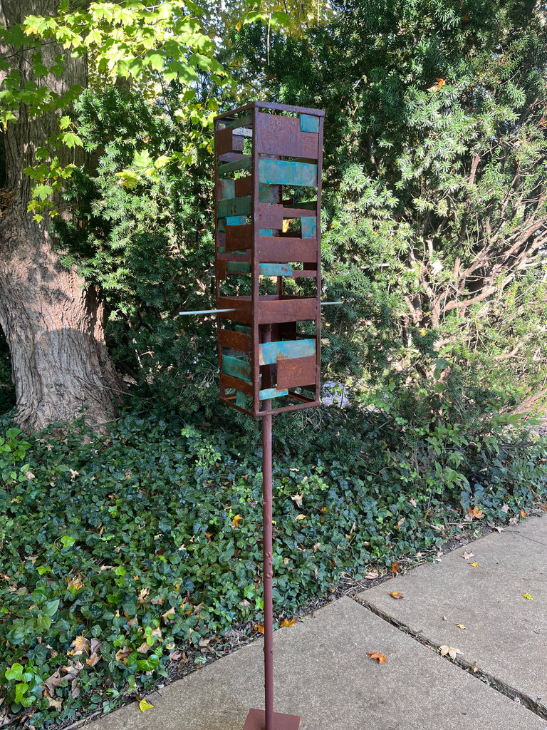 Modern Bird Feeder #448 in Welded Steel and Copper with Natural Patina