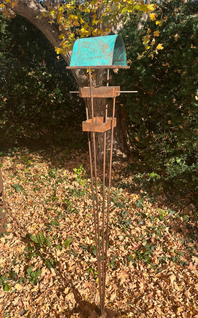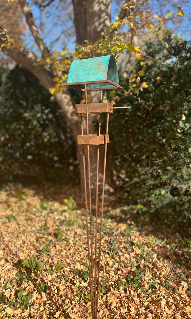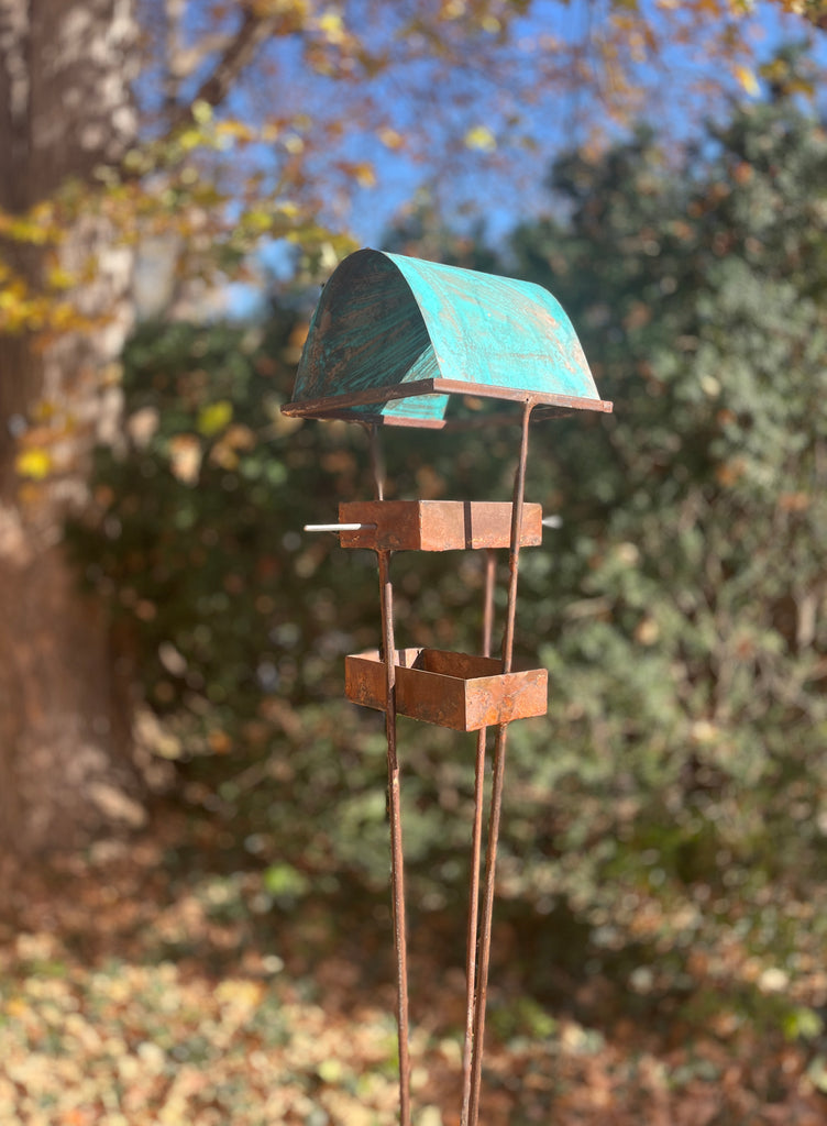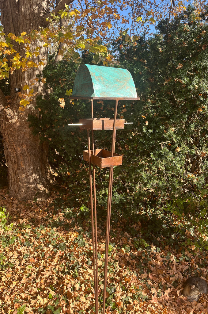 This hand crafted, welded steel bird feeder stands approximately 6' tall. The top feeder sections each measure 5" X 8", and the roof is 11" X 11". The entire piece has been treated with a patina which turns  the copper roof a turquoise blue and the mild steel a rust color.
