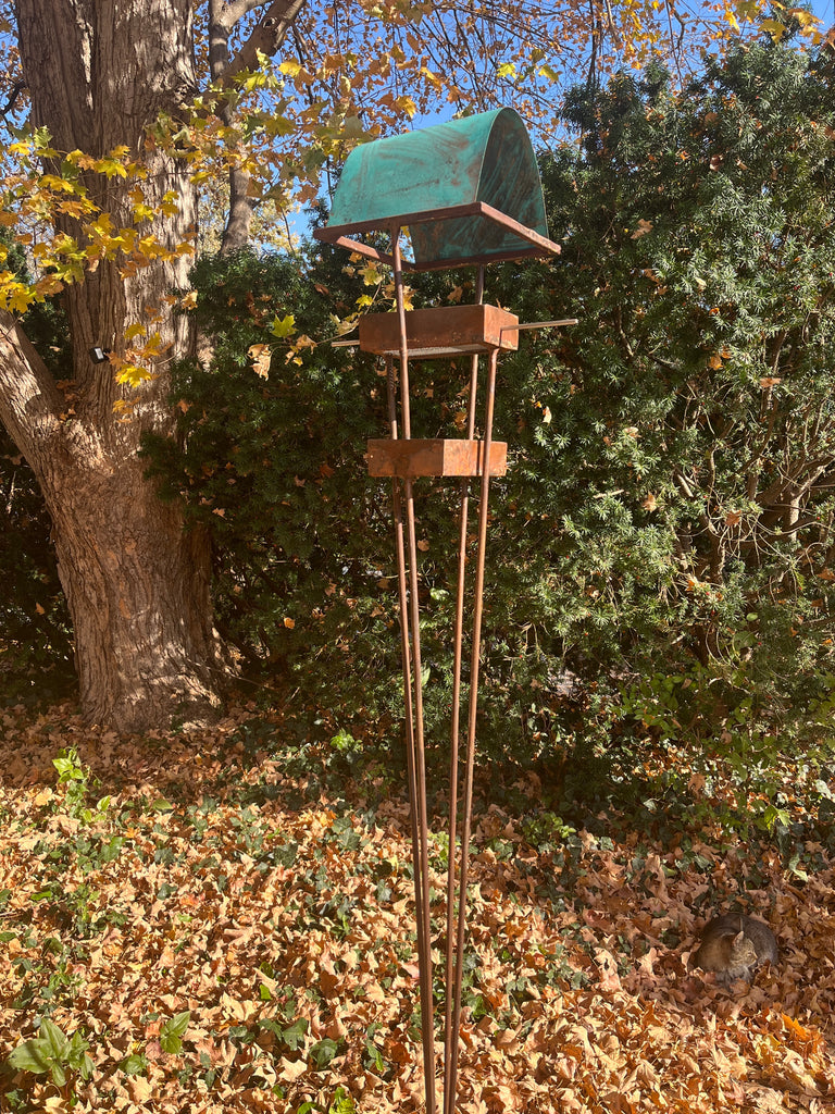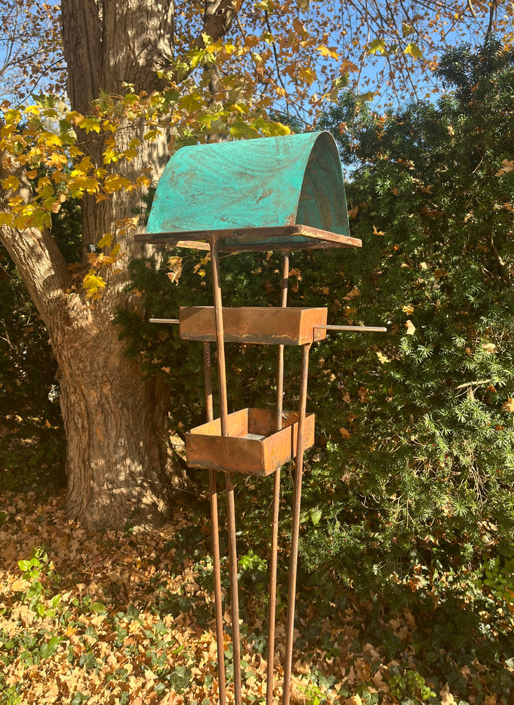 Modern Bird Feeder #449 in Welded Steel and Copper with Natural Patina