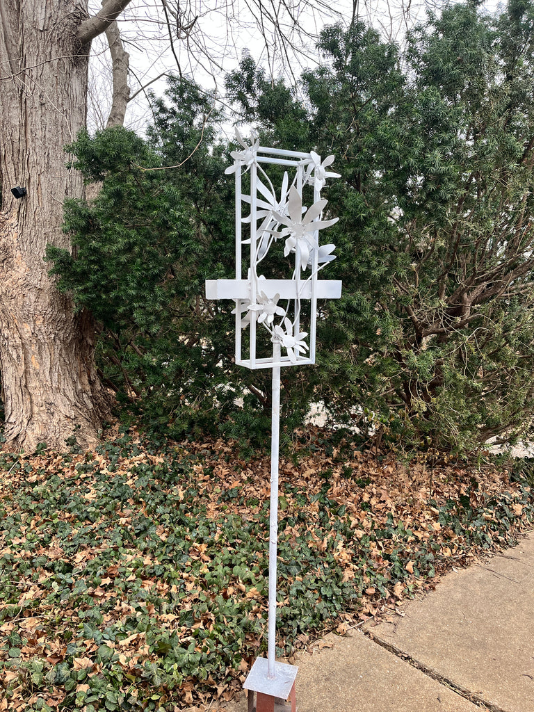 The upright support is welded to an "I-beam" shaped base which has been uniquely designed to allow the piece to stand securely upright and about 6 feet tall once "planted" into the ground approximately 8 -10 inches deep.