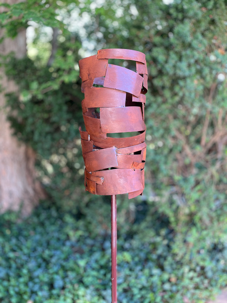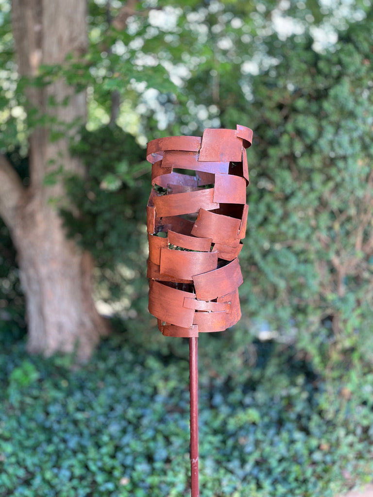 This hand crafted, welded steel bird feeder stands approximately 6' tall. The top feeder section measures about 24" X 11", and the seed tray is 7" X 7". The entire piece has been treated with a patina which turns the steel a deep rusty red.