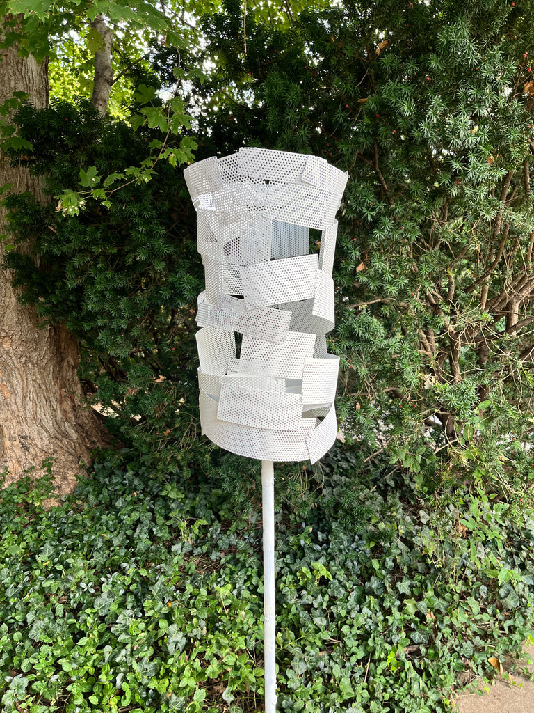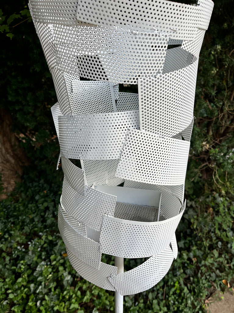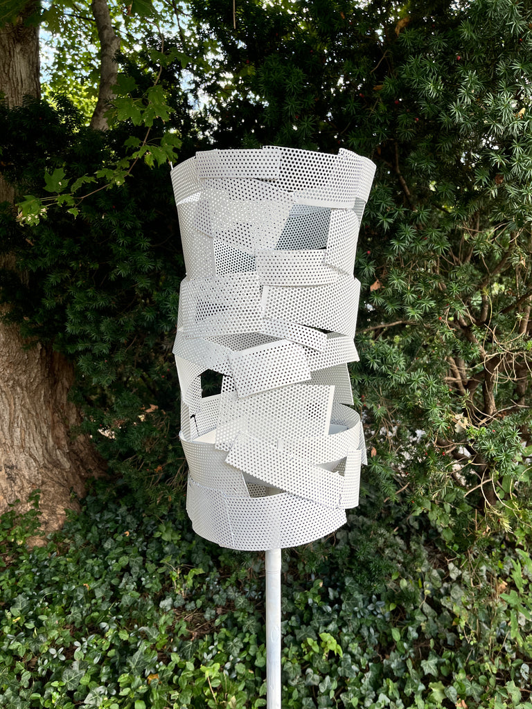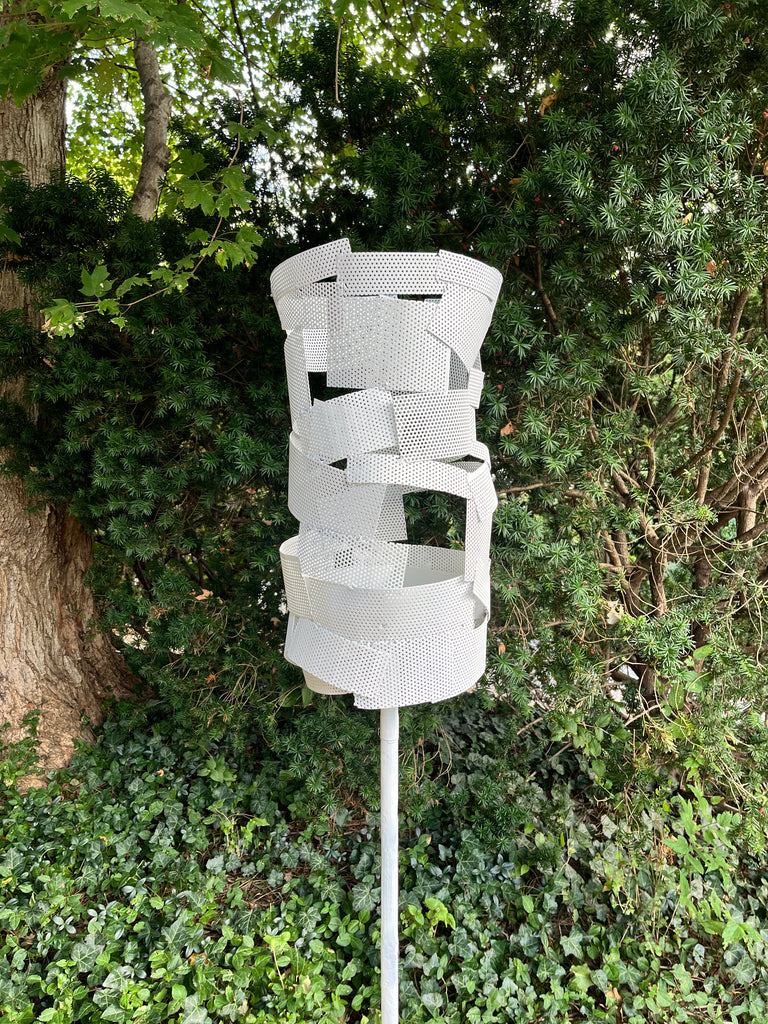 'Spin' Modern Bird Feeder #3 - perforated steel with white enamel finish