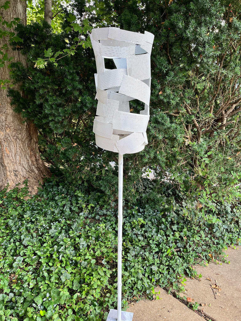 The upright support is welded to an "I-beam" shaped base which has been uniquely designed to allow the piece to stand securely upright and about 6 feet tall once "planted" into the ground approximately 8 -10 inches deep.