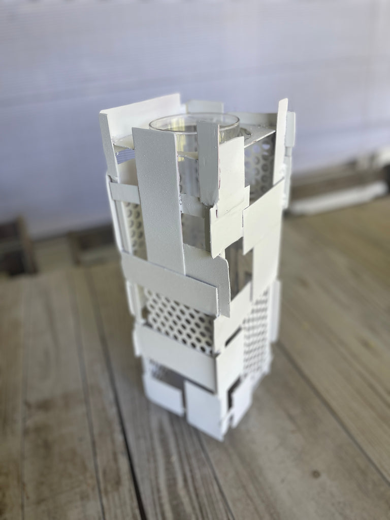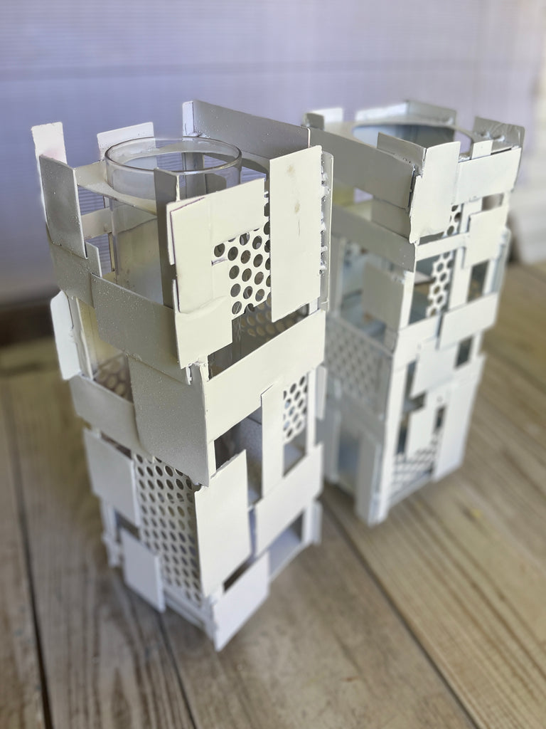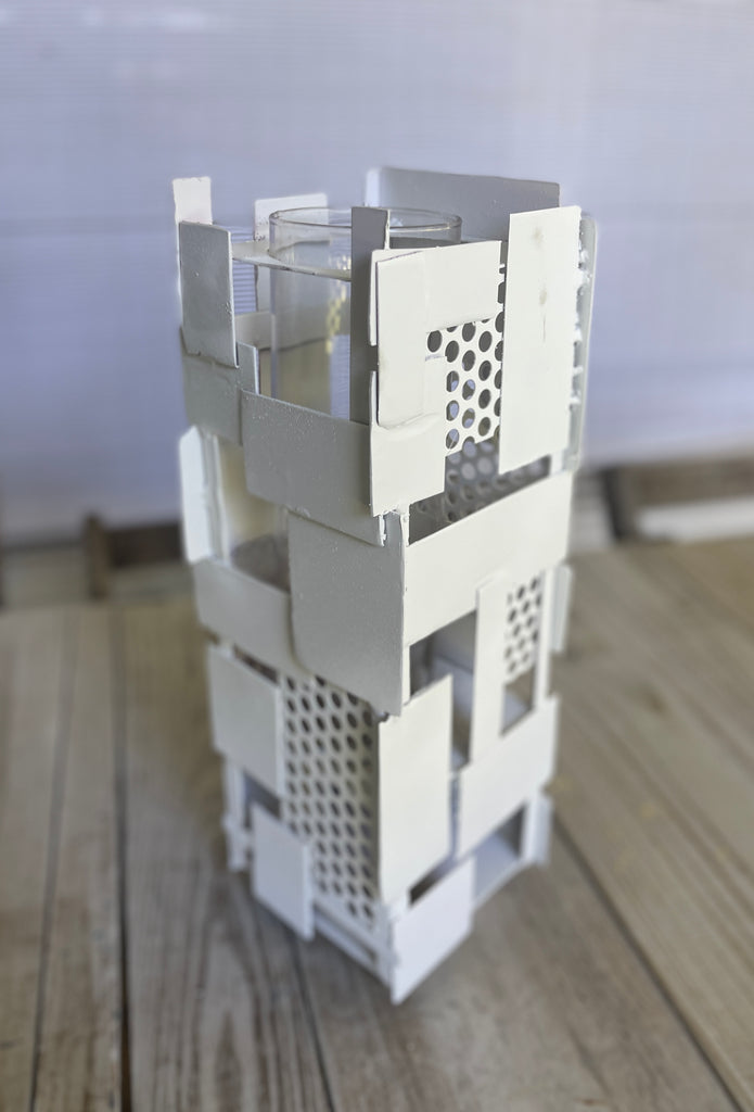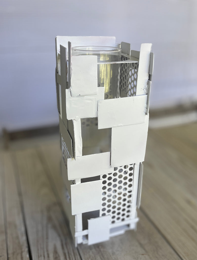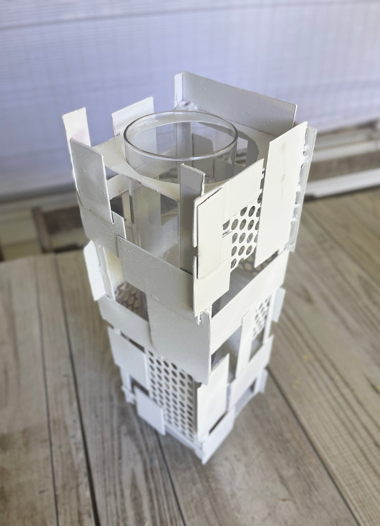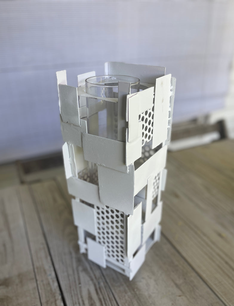 This modern steel vase was hand welded from small steel cut-off squares and rectangles that inevitably accumulate in my studio. It measures 5" X 5" X 17" and the glass insert measures 10.5" X 3.5" although the metal structure will accommodate any similar diameter glass insert. It is finished with a white spray enamel but can be painted in any color you'd like.